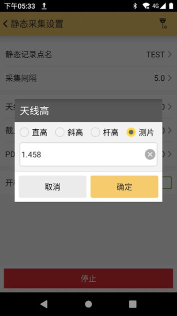 4. 天线高度:天线高的量取方式分为直高、斜高、杆高和测片高。其中,直高是地面到主机底部的垂直高度+天线相位中心到主机底部的高度;斜高是橡胶圈中部到地面点的高度;杆高是主机下面的对中杆的高度;测片高是地面点量至测高片最外围的高度。静态测量中常采用测片高,即使用卷尺测量测片最外围到控制点的垂直高度(单位:米),并将该值输入软件。精确的天线高度是后续数据处理中校正垂直坐标的关键。